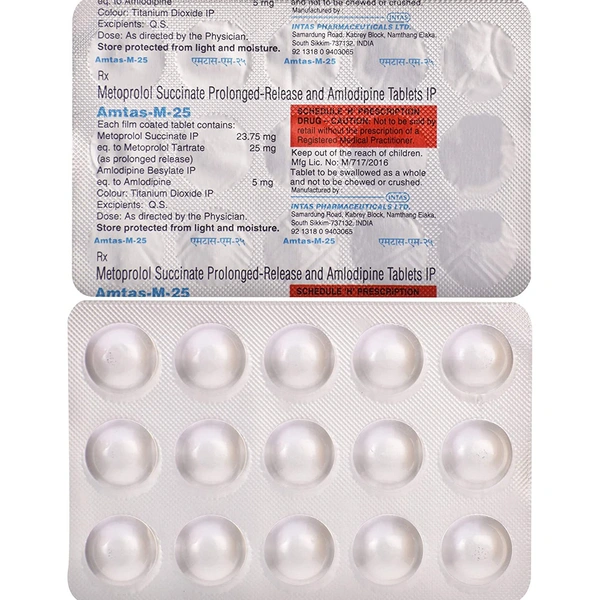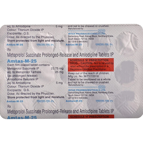 Amtas-M 25 Tablet PR contains two medicines, both of which help to control high blood pressure and heart rate. It is also used for heart-related chest pain, abnormal heart rhythms and chronic (long-term) heart failure.