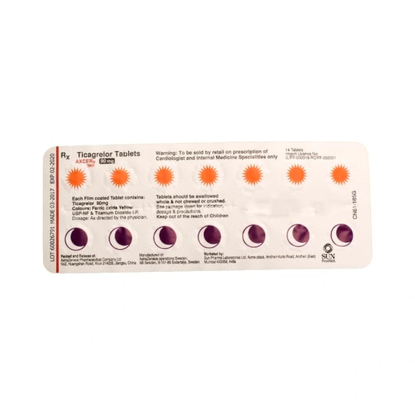 Axcer 90mg Tablet is also used to treat people with a recent heart attack or severe heart-related chest pain (unstable angina), who have undergone stenting of the heart. It helps to prevent serious heart-related problems like having another heart attack, stroke, or formation of blood clots in stents in such people.