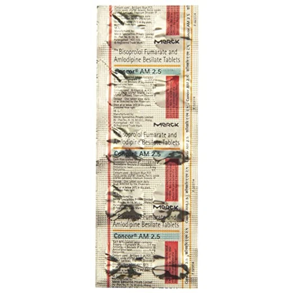 Concor AM 2.5 Tablet is used to treat hypertension (high blood pressure). This is a combination of two medicines that controls blood pressure when a single medication is not effective. It helps to lower high blood pressure and thus reduces the chances of future heart attack and stroke.