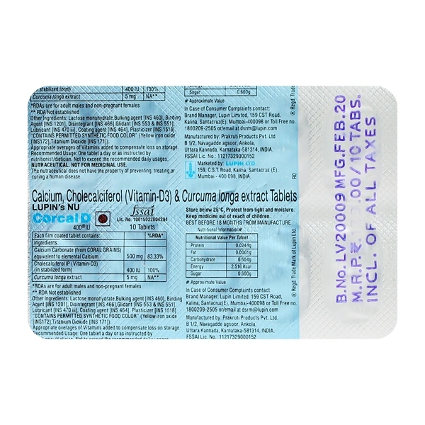 Corcal D 400 IU Tablet contains Coral Calcium (500mg) and Vitamin D3 (400IU).