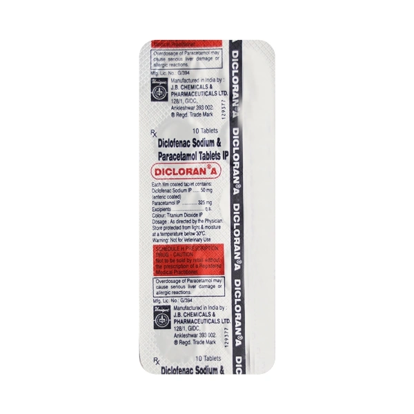 Dicloran A Tablet is a pain-relieving medicine. It is used to reduce pain and inflammation in conditions like rheumatoid arthritis, ankylosing spondylitis, and osteoarthritis. It may also be used to relieve muscle pain, back pain, toothache, or pain in the ear and throat.