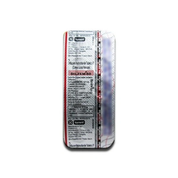 Dilzem 60 Tablet CR is used to treat angina (heart-related chest pain), high blood pressure, and some types of irregular heartbeats (arrhythmia). It is known as a calcium channel blocker. It works by relaxing blood vessels to lower blood pressure. This helps to reduce the workload of the heart.