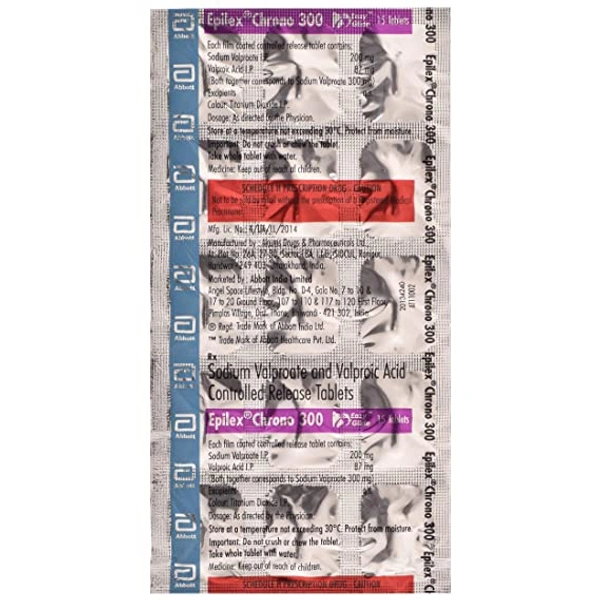 Epilex Chrono 300 Tablet CR should be taken with food. Your doctor will decide the correct dose for you. This may increase gradually until your condition is stable. This medicine may take several weeks to work but it is important to take it regularly to get the benefit. Do not stop taking it, even if you feel fine unless your doctor advises you to. You may have more seizures, or your bipolar disorder may get worse.