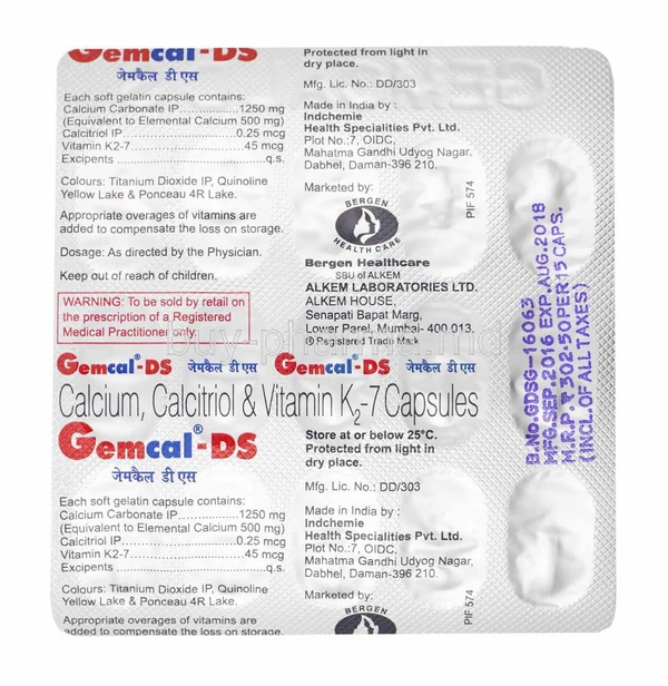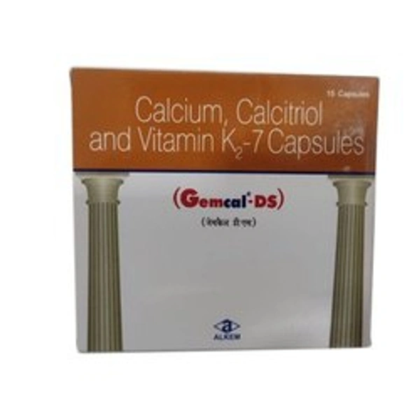 Gemcal-DS Soft Gelatin Capsule is a vitamin supplement that can help get healthy and strong bones and teeth. The tablet may support the functioning of nerves, cells, muscles, and the heart. It contains essential vitamins and minerals to help support bone health. The tablet can be beneficial for individuals with low levels of calcitriol, calcium, and vitamin K2-7. It helps manage conditions associated with calcium and vitamin K2-7 deficiency like weak bones, joint pains, osteoarthritis, and risk of bone injuries.