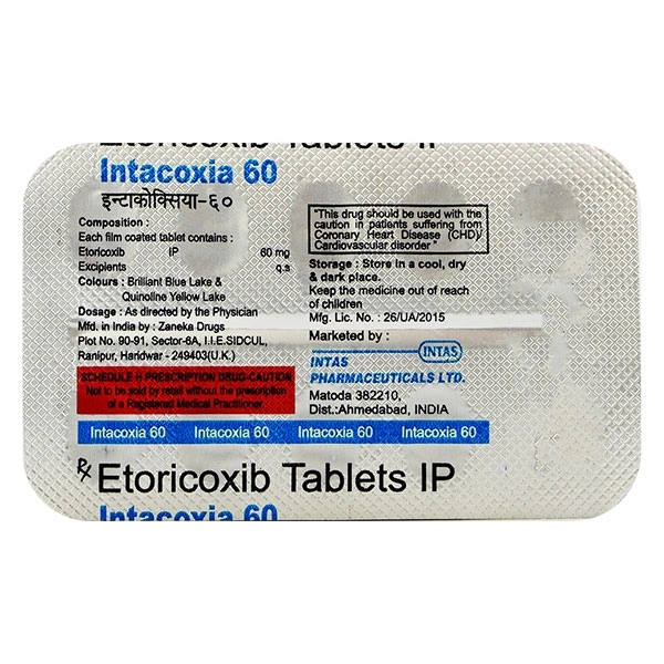 Intacoxia 60mg Tablet is a pain-relieving medicine. It is used for relieving moderate pain and swelling of joints associated with different forms of gout and arthritis. It is also used for short-term treatment of moderate pain after dental surgery in people 16 years of age and older.