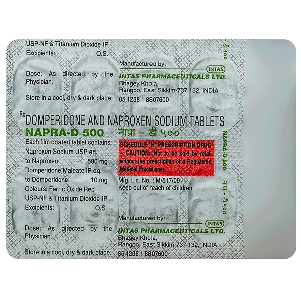 Napra D 500 Tablet may be prescribed alone or in combination with another medicine. It can be taken with or without food. The dose and duration will depend on the severity of your condition and how well it helps your symptoms. Use it regularly and do not discontinue using it until the doctor tells you it is alright to stop.