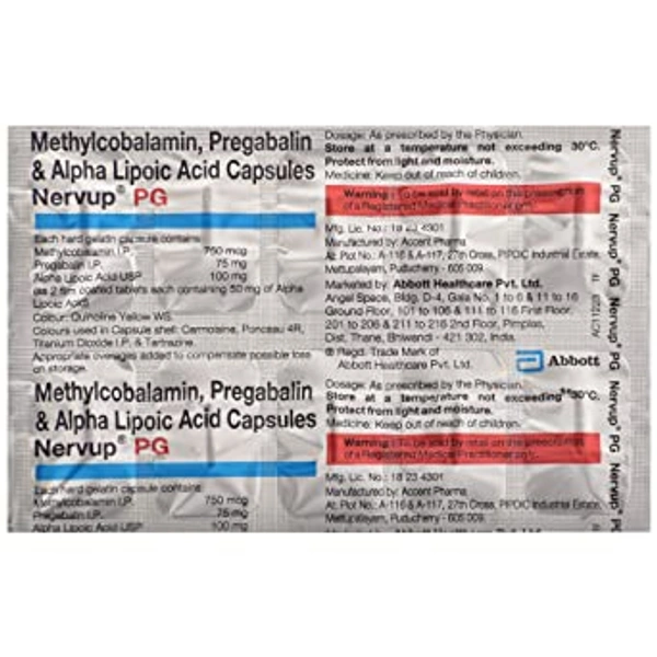 Nervup PG Capsule is a combination medicine used in the treatment of neuropathic pain. It calms the damaged or overactive nerves by acting on the brain, thereby decreasing the pain sensation. It also helps in the regeneration of damaged nerves in the body.