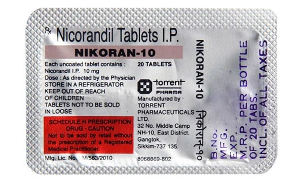 Nikoran 10 Tablet is a medicine used to prevent and treat heart-related chest pain (angina). It is usually prescribed when other heart medicines are either not suitable or have not worked. It reduces the risk of an angina attack by widening blood vessels and improving blood flow to the heart.