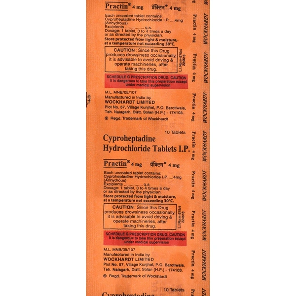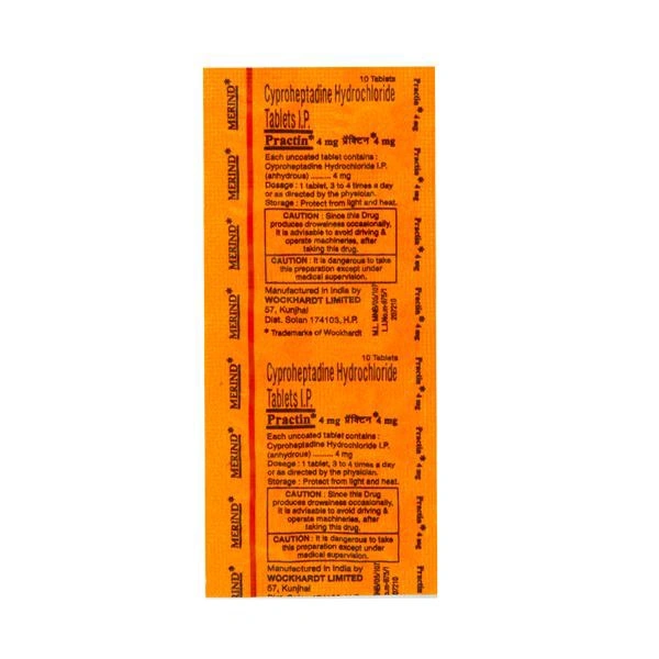 Practin 4mg Tablet belongs to a group of medicines called antihistamines. It is used in the treatment of various allergic conditions. It relieves symptoms of inflammation as well as itching, swelling and rashes. It is also used to treat loss of appetite (need for food). It is an effective hunger stimulant.
