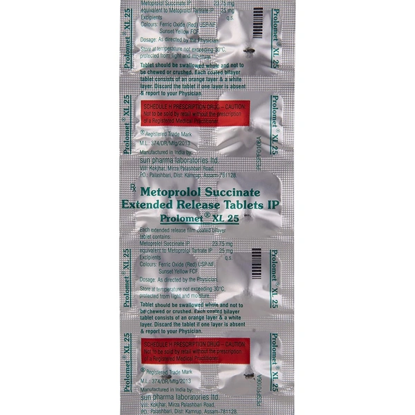 Prolomet XL 25 Tablet belongs to a group of medicines called beta-blockers. It is used to treat high blood pressure (hypertension), angina (heart-related chest pain), and irregular heart rhythms (arrhythmia). It also helps to prevent migraines, future heart attacks, and stroke.