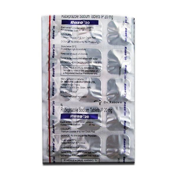 Razo 20 Tablet is also used to prevent stomach ulcers and acidity that may be seen with the prolonged use of painkillers. It belongs to a class of medicines known as proton pump inhibitors (PPIs). This medicine should be taken one hour before a meal, preferably in the morning. The dose will depend on your underlying condition and how you respond to the medicine. Try to take it regularly at the same time each day as advised by your doctor. You should keep on taking it as prescribed even if your symptoms disappear quickly. You may be able to help improve your symptoms by eating smaller meals more often and avoiding caffeinated drinks like tea and coffee, and spicy or fatty foods.