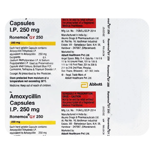 Ronemox 250mg Capsule is used to treat a variety of bacterial infections. It is effective in infections of the throat, ear, nasal sinuses, respiratory tract (e.g., pneumonia), urinary tract, skin and soft tissue, and typhoid fever.