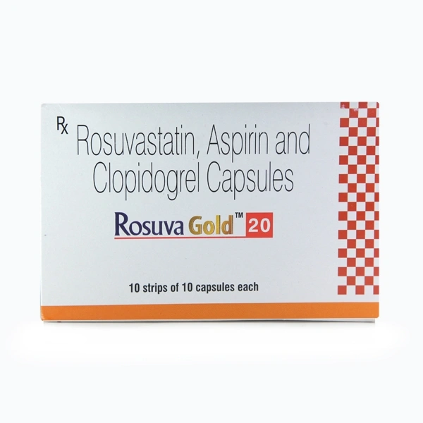Rosuva Gold 20 Capsule is used for prevention of heart attack. It is a combination of medicines that prevent clot formation in the blood vessels. It also helps to reduce increased cholesterol and triglycerides levels.