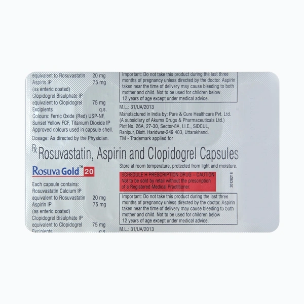 Rosuva Gold 20 Capsule is used for prevention of heart attack. It is a combination of medicines that prevents clot formation in the blood vessels. It also helps to reduce increased cholesterol and triglycerides levels. This medicine should be taken with food regularly at a fixed time each day. This medicine should not be stopped abruptly and taken strictly as advised by the doctor. Lifestyle changes like low-fat diet, exercise, and not smoking may help this medicine work better. This medicine increases your risk of bleeding, so it is important to be careful while shaving, cutting nails, and using sharp objects. Few common side effects of this medicine may include stomach pain, indigestion, diarrhea, and muscle pain.
