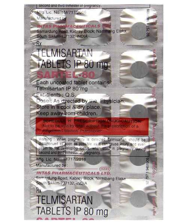 Sartel 80 Tablet can be prescribed either alone or in combination with other medicines. It may be taken with or without food during the day or at night. However, try to take it at the same time each day to get the most benefit. It is important to continue taking it regularly even if you feel well or if your blood pressure is controlled. Most people with high blood pressure do not feel ill, but if you stop taking this medicine, your condition could get worse. This is a widely used medicine and is considered safe for long-term use.