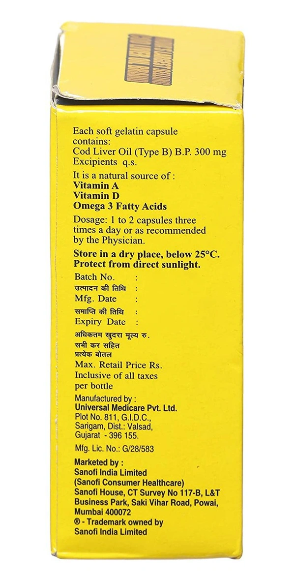 Seacod Cod Liver Oil capsule contains cod liver oil as active ingredient. The capsule has several helath benefits and is essential for various functions of body. It is recommended for healthy living.