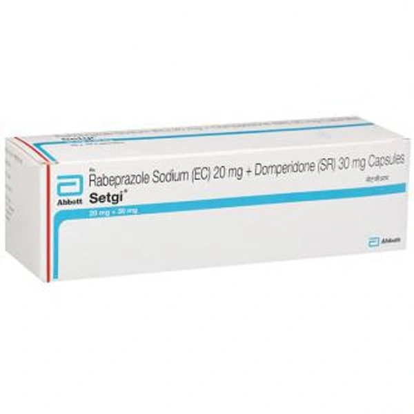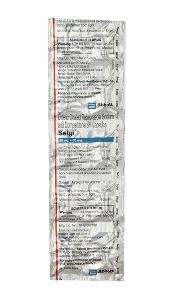 Setgi Capsule SR is a combination medicine used to treat gastroesophageal reflux disease (Acid reflux) and peptic ulcer disease by relieving the symptoms of acidity such as heartburn, stomach pain, or irritation. It also neutralizes the acid and promotes easy passage of gas to reduce stomach discomfort.