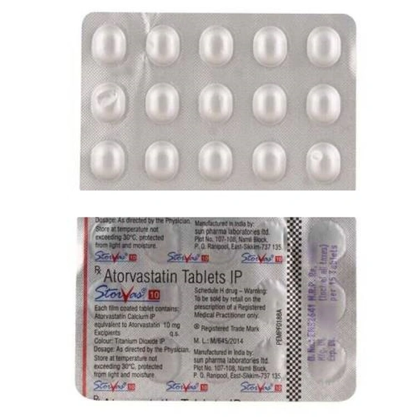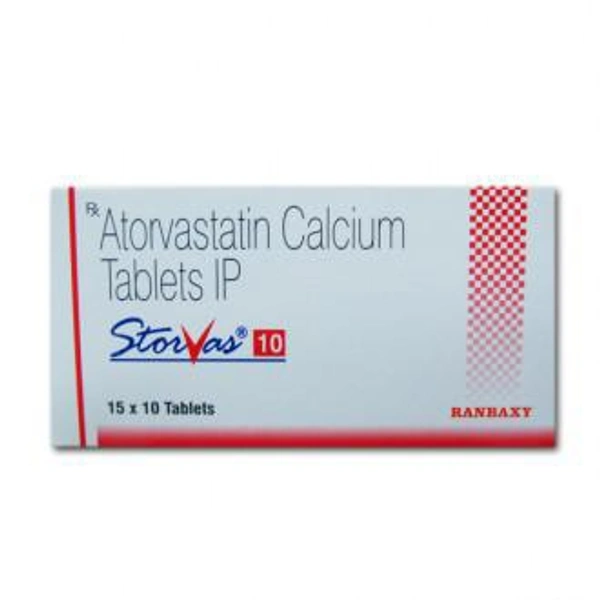 Storvas 10 Tablet belongs to a group of medicines called statins. It is used to lower cholesterol and to reduce the risk of heart diseases. Cholesterol is a fatty substance that builds up in your blood vessels and causes narrowing, which may lead to a heart attack or stroke.