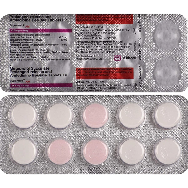 Supermet-AM Tablet PR contains two medicines, both of which help to control high blood pressure and heart rate. It is also used for heart-related chest pain, abnormal heart rhythms and chronic (long-term) heart failure.