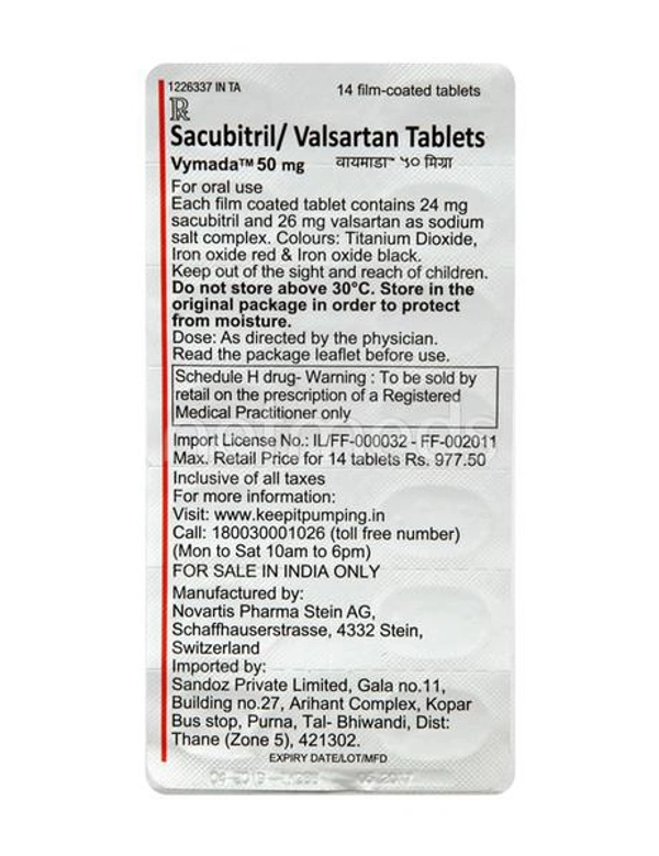 Vymada 50mg Tablet is a combination medicine used to treat heart failure. It reduces the risk of hospitalization and death due to long-lasting (chronic) heart failure.